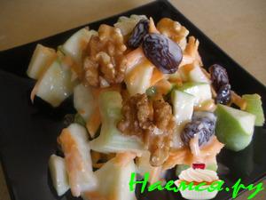 Орехи подрумянить на сухой сковородке. Груши нарезать. Смешать с остальными компонентами.