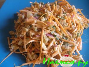 Картофель, морковь и яйца отварить, охладить, очистить и мелко нарезать.