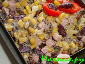 Все приготовленные продукты смешиваем с майонезом, а за 10 минут перед подачей на стол посыпаем сухариками.