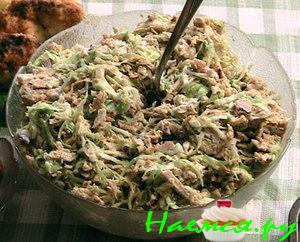 Мясо режем очень тонкой соломкой(лучше это делать,когда мясо подмороженное).Тонкими полукольцами режем лук.Готовим крепкий расствор воды с уксусом .Мясо с луком солим и заливаем рассолом.Оставляем мариноваться на ночь.На следуюший день мясо с луком отжимаем и на сковороде выпариваем оставшуюся жидкость 3-4 мин.Морковь трём на тёрке соломкой и опускаем в расколённое масло на 3-4 мин.Всё перемешиваем.Добавляем натёртый на той же тёрке огурец.Заправляем чесноком и перцем,при необходимости досаливаем.