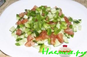Луковицу порезать полукольцами и замариновать в уксусе. Крупными кусочками нарезаем огурцы, помидоры, перцы, смешиваем и выкладываем на блюдо.Сверху выкладываем лук, украшаем маслинами и, порезанным на мелкие кусочки, сыром.Готовим заправку: 1ч. ложечку горчицы, 1 ч. л. уксуса и 2 - 3ст. л. оливкового масла, все тщательно смешать и полить салат.
