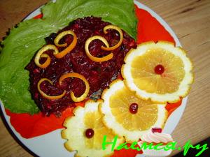Берём салатную свёклу,отвариваем.Я беру свёклу цилиндрической формы-этот сорт всегда красный и сладкий.Ну, не буду спорить,есть конечно и другие сорта,тоже сладкие и красные.Но я почему-то, так уже привыкла к такому сорту свеклы.Потом натираем свёклу на тёрке (буряковой),туда же добавляю чеснок (выдавленный на чеснокодавке).В отдельной посуде заливаю кипятком чернослив и отдельно изюм (т.е. запариваю)на 15-20 мин.После того, как чернослив запарился нарезаю его на небольшие кусочки и смешиваю вместе со свеклой туда же изюм и грецкий орех.Заправляю салат сметаной и даю настояться 10-15 мин.Вкус получается с "изюминкой".