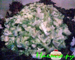 Капусту нашинковать посолить и слегка перемешать. Нарезать огурцы, крабовые палочки. Добавить зеленый горошек. Далее соус для заливки. Блендером измельчила чеснок, добавила горчицы (не пожалела),сок лимона, соль, сахар, желток. Все перемешала блендером и добавила частями оливковое масло. Получился соус типа майонез только нежный и легкий. Перемешала салат с соусом и все.