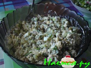 Слои:картофель,зелёный лук, колбаса,огурец,яйца,картофель.