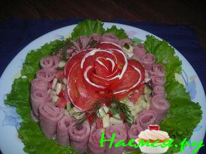 Все ингредиенты порезать соломкой (можно кубиком) перемешать, заправить майонезом и выложить горкой на листьях салата.