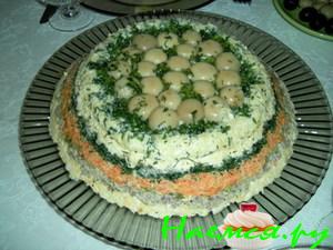 После надо этот салат перевернуть на плоское блюдо, больше диаметром чем салатница!