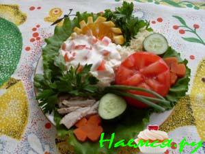 Подготовленные овощи и фарш перемешать, заправить майонезом.