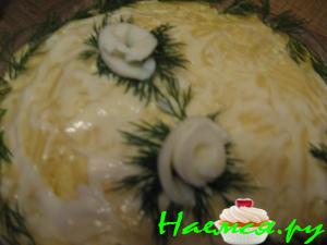 После слить маринад и добавить нарезаный соломкой кальмар и яйца.Все смешать с майонезом.