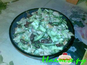 -Соединить шампиньоны и курочку, добавить фасоль, заправить майонезом.