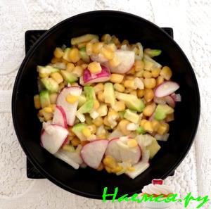 Добавить ананасы, разрезанные пополам оливки и горошек.