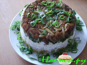 Салат выкладывать слоями: целые грыбы, шапочками вниз, твердый сыр натертый, яйца натертые, ветчину соломкой, лук кольцами(маринад для лука: 1 ч.л уксуса, 1 ч.л воды,пол ч.л соли и пол ч.л сахара,на 10 минут),картофель натертый. Каждый слой смазать майонезом. Поставить в прохладное место на час. После накрыть блюдо другой тарелкой и осторожно перевернуть, чтобы шапочки грибов были сверху. Украсить зеленью.