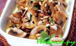 Чернослив распарить, мелко измельчить. Ветчину нарезать кубиками, сыр натереть. Грибы и зелень измельчить. С апельсинов срезать верхнюю часть. Аккуратно, с помощью ложки вынуть апельсиновую мякоть, измельчить. Смешать в мисочке все ингредиенты, заправить сметаной и майонезом, все перемешать. Наполнить салатиком апельсины и выложить на тарелочку. Украсить черносливом и зеленью.