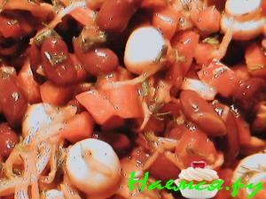 Лук нарезать тонкими полукольцами, огурцы сначала вдоль, потом на ломтики, нарезать петрушку, смешать с фасолью (жидкость слить) и заправить маслом.