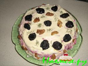 Нарезанные ингредиенты уложить слоями в следующей последовательноссти: картофель, морковь, мясо, свекла, чернослив, смазывая каждый слой майонезом.