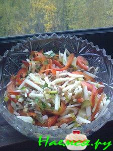 Ингридиенты нарезаются соломкой. Все перемешать и сдобрить майонезом