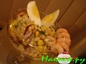 соединить кукурузу, горошек, фасоль, рыбу, лук