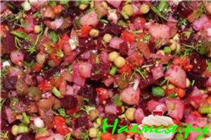 Очищенную от кожуры свеклу так же режем на кубики и снова перемешиваем.
