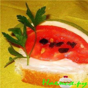 Помидоры нарезать колечками, сырок - тонкими ломтиками. Батон разогреть в тостере, намазать маслом, положить на него лист салата, затем - нарезанные помидоры, паштет. Сверху уложить ломтики сыра.