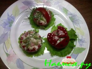 У спелых помидоров срезать со стороны плодоножки четвертую часть, плоды слегка обжарить для удаления сока и семян, сделать углубление, посыпать солью и перцем.