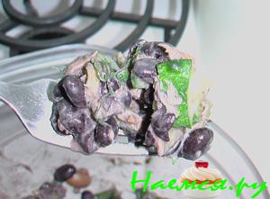 Отварить куриное феле, охладить и руками поломать на кусочки. Виноград, если крупный, порезать пополам (если есть косточки - удалить), перец порезать крупными квадратиками, сыр - мельче, чем перец. Заправить майонезом.