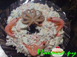 Устрици и кальмары обдаём соленым кипятком.Крабы отварить 3 минуты в укропной воде.я покупала все готовое.