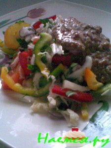 Режим китайскую капусту, сладкий перчик, лук. Оливки без косточек целиком. Сыр на терке. Заправляем майонезом. Не солим!!! Соли хватает в сыре, оливках и майонезе.