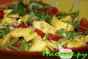 Все компоненты мелко порезать. С помидоров слить масло и тоже порезать. Смешать и заправить.