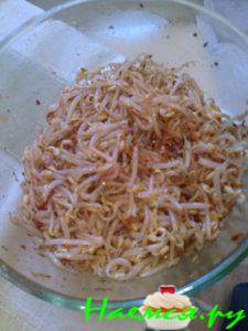 Ростки сои и зеленый лук нарезать в длину по 3-4 см, перемешать с редькой, добавить кунжут.
