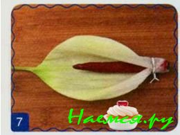 9. Нанизать шпажку цветок. Вырезать из зеленой части лука-порея чашелистик.