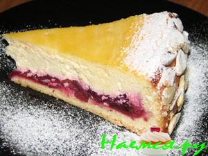 Творожную массу выкладываем поверх вишневой начинки, после чего выпекаем в духовке нагретой до 175* в течение 50 минут.