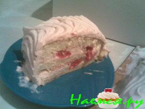 Бисквит пропитать сиропом, смазать кремом, свернуть в рулет. Сверху также замазать кремом, чтоб спрятать те неровности, которые могут получится при сворачивании коржа. Поставить в морозилку на 30-40 минут (после хорошего охлаждения будет легче резать).