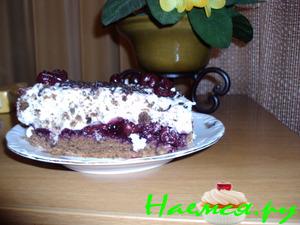 Выложить получившийся мусс на торт, поставить в холодильник на час. После застывания украсить муссом (или взбитыми сливками), тертым шоколадом и вишнями.