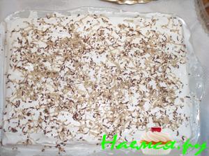 Натереть шоколад. Насыпать его ровным слоем на горячий корж.