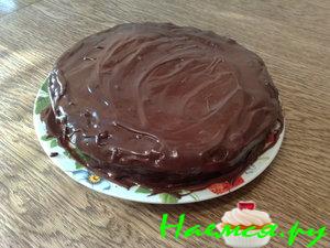 Дальше все просто - пропитать коржи сиропом, прослоить конфитюром. Верх и бока торта покрыть шоколадом. И в холодильник на полчасика.