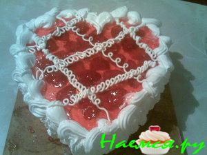 Верх и бока торта покрыть масляным кремом, разровнять. Бока и бортик украсить при помощи взбитых сливок. Выложить клубнику, залить ее полузастывшим желе. Убрать торт в холодильник до застывания желе. Затем доукрасить сливками поверх застывшего желе.