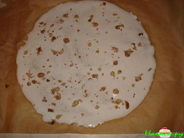 Достаем тесто из холодильника и делим на 6 частей. Раскатываем корж, намазываем его взбитым белком, и посыпаем орехами. Выпекаем корж 10-15 минут, безе должно слегка подрумянится и подняться. Так выпекаем все 6 коржей.