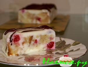 На дно выложить немного подготовленных ягод, залить небольшим количеством сметанной смеси, затем выложить бисквит, опять залить сметано-желатиновой смесью. И так продолжать, пока не закончатся ингредиенты. Последний слой, конечно, должен быть сметанно-желатиновый.