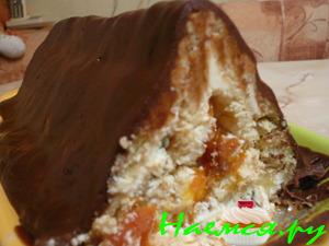 Из 3 ст.л., 3ст.л.какао,100г сахара и 50г масла варим глазурь, немного остужаем, заливаем застывший тортик(пленку снять) и ставим его в холодильник на часок, чтобы застыла глазурь