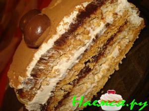 Одна полоса безешного коржа, шоколадная прослойка, крем каппуччино. Так повторить ещё три раза. Бока обмазать кремом каппуччино.