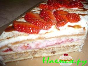 Творог (300гр) взбиваем с сахаром и выкладываем половину смеси на бисквитный корж туда же и часть клубники, накрываем коржом из печенья и выкладываем оставшуюся часть творожной массы и практически всю клубнику, немного оставляем для украшения, накрываем вторым бисквитным коржом и намазываем его сверху плавленым сырком, ( не пугайтесь, он совершенно не испортит вкус тортика, если конечно сам сырок не просто сливочный а с привкусом чего нибудь)