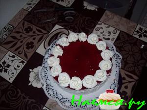Готовим крем: творог смешиваем с ванилином и сахаром.Желатин замачиваем на 5 мин.в воде,отжимаем и растворяем на медленном огне. Добавляем туда по немного творог и быстро мешаем.Массу выкладываем на торт. Варим тортенгус и заливаем им осторожно торт.Вишню макаем в растопленный шоколад и украшаем ей торт.