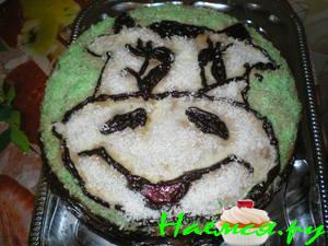 Делаем бисквит – взбить яйцо сахаром до бела, добавить сметану, крахмал, гашеную соду и хорошо перемешать, всыпать муку и перемешать. Разделить тесто на две части. В одну натереть яблоко на крупной терке. Выпечь коржи в прямоугольной форме. Остудить. Корж с яблоком – основа. Проколоть его во многих местах вилкой и хорошо пропитать абрикосовым сиропом. Когда сироп впитается, капнуть по периметру 2 ст. л. сливового пюре. Для пюре взять 0,4 кг. мягких слив, удалить косточку, взбить в блендере и протереть через сито, добавить 2-3 ст.л. сахара и прогреть на огне до растворения сахара.