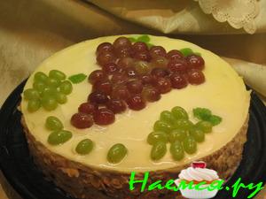 Отложить 1/3 крема для украшения верха. В другую часть добавить 500г винограда( чтоб ягодки были сухими).Готовый бисквит разрезать на две части .Кладем бисквит на блюдо и ставим кольцевую форму, выливаем туда творожный крем и разравниваем,накрываем второй частью бисквита. Смазываем поверхность торта отложенным кремом и засыпаем виноградом.Ставим в холодильник для застывания.
