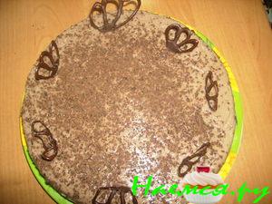 Остывший бисквит вытащить из формы разрезать вдоль, пропитать вишнёвым соком, уложить в разъёмную форму. На дно чуть крема, потом корж, пропитка, почти весь крем (оставить чуть для верха), корж, пропитка, оставшийся крем. Поставить для застывания в холодильник на пару часов(лучше на ночь), торт вырезать из формы, украсить по настроению.(Я украсила тёртым шоколадом и и же обсыпала бока)