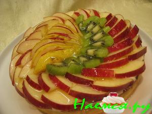 Тесто с легка раскатать уложит в посыпанную мукой форму или порционные формочки, с верху фрукты, полить кремом и поставить в разогретую духовку на 25-30м.