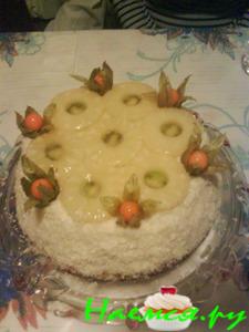 Киви очистить нарезать кружочками, апельсин почистить разделить на дольки, дольки нарезать. Верх торта декорируем фруктами, можно как на фото или как понравится. Сверху фрукты я залила бесцветным желе для торта. Бока - взбила сливки с закрепителем и сахаром - и отсадила цветочки из кондитерского шприца.
