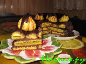 Коржи слегка пропитать сладким чаем с коньяком. Промазать кремом.