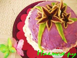 Разделить на пополам взбитые сливки. Одну часть смешать с пищевой краской и смазываем верх торта. Другую часть сливок выдавливаем по краям.