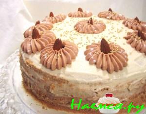 Готовый бисквит остужаем,разрезаем на два коржа.Пропитываем половиной крема(крем должен быть горячим),накрываем вторым коржом,намазываем оставшимся кремом и посыпаем рубленными орехами.