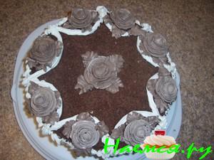 Бисквит разрезать ниткой на 3 части, средний пропитать ромом, смазать поочерёдно кремом, залить глазурью. Настоять не меньше 4 часов.